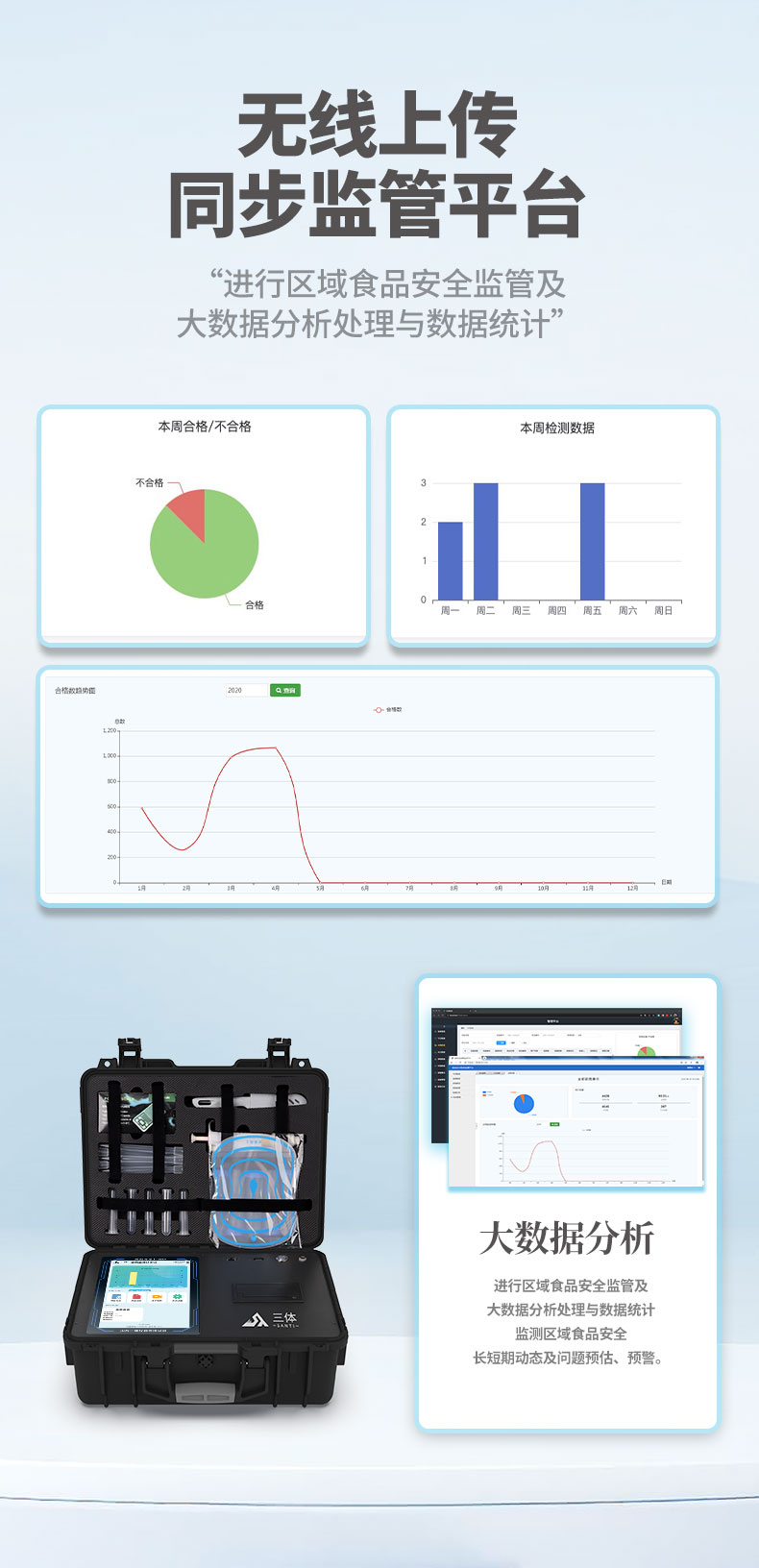 11、仪器具有 wifi 联网上传、RJ45网线连接功能,可以快速上传数据。同步对接监管平台,数据可局域网和互联网数据上传,检测结果直接传至食品安全监管平台。进行区域食品安全监管及大数据分析处理与数据统计,检测区域食品安全长短期动态,达到食品安全问题预估、预警。