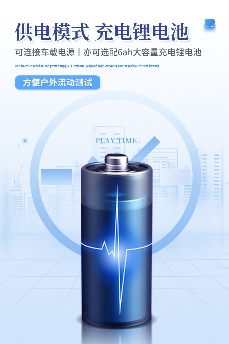 9.供电模式:仪器交直流两用,直流12V供电(标配),可连接车载电源,亦可选配6ah大容量充电锂电池,方便户外流动测试。