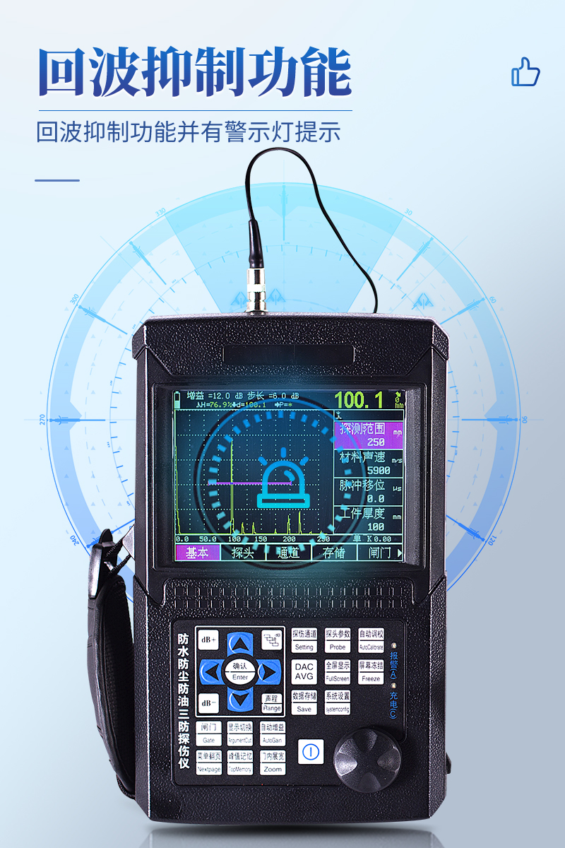 概述便携式超声波探伤仪能够快速便捷、无损伤、准确地进行工件内部多种缺陷如裂纹、焊缝、气孔、砂眼、夹杂、折叠等的检测、定位、评估及诊断,广泛应用于电力、石化、锅炉压力容器、钢结构、航空航天、铁路交通、汽车、机械等领域。它是检测行业的重要仪器。主要功能● 高精良定量、定位,适合较近和较远距