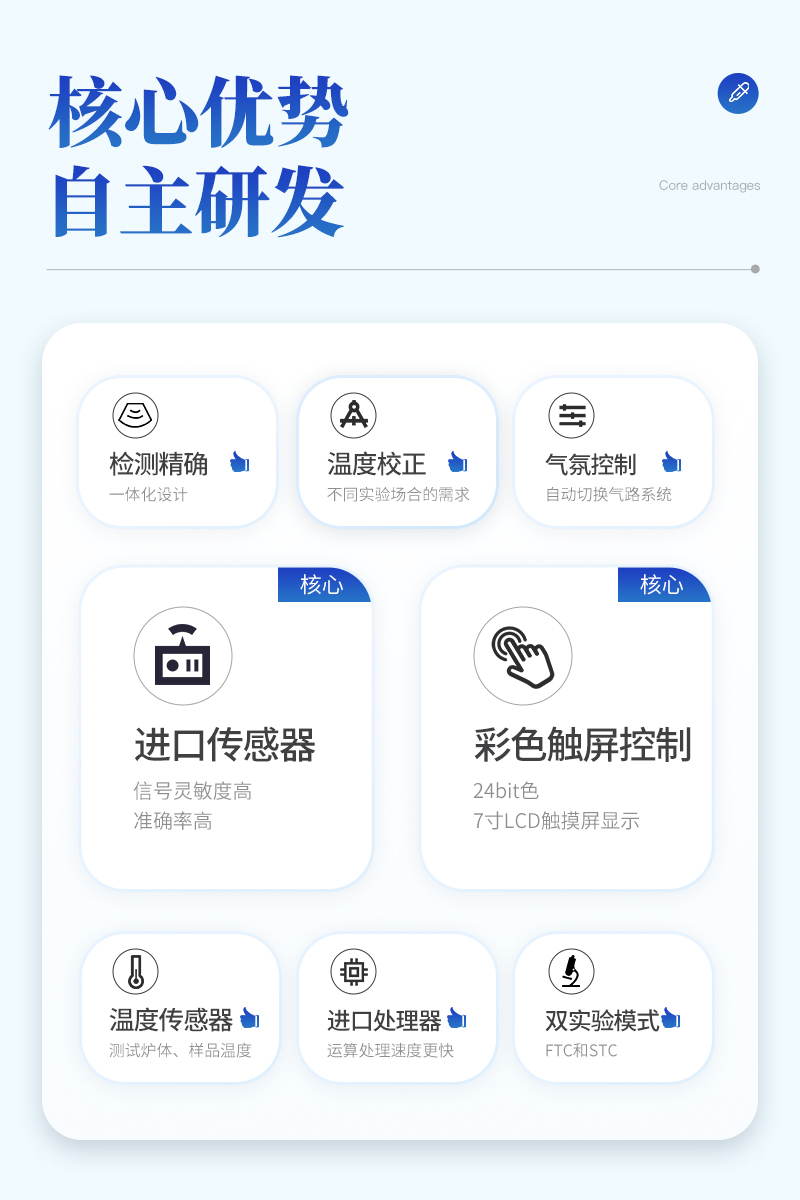 10、相互独立的双温度传感器,可以同时分别测试炉体温度和样品温度。