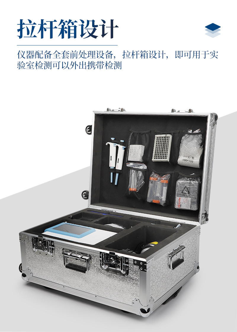 12、仪器配备全套前处理设备,拉杆箱设计,即可用于实验室检测可以外出携带检测。