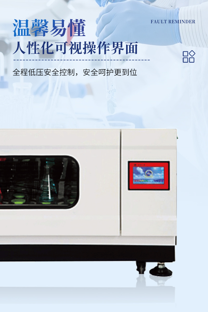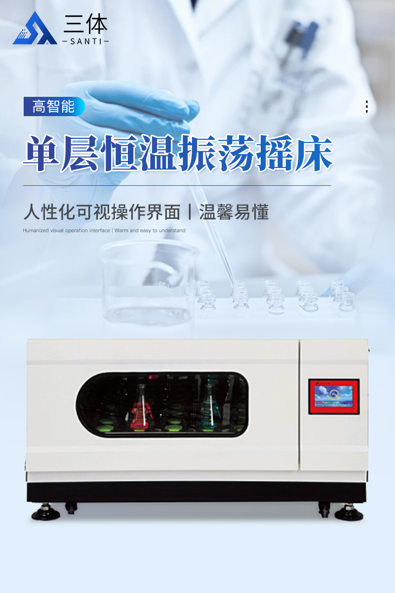 单层恒温振荡摇床人性化可视操作界面,温馨易懂,全程低压安全控制,安全呵护更到位,可开合式换气系统,换气补氧想有就有,高亮镜面内胆,除菌更轻松。