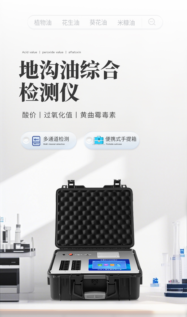 食用油安全检测仪为集成化油品快速检测分析设备,能够快速检测食用植物油、食用猪油、花生油、葵花油、米糠油、食品、肉制品中的黄曲霉毒素,苯并芘,辣椒素等含量;通过检测可确定植物油是否符合国家标准或是否为劣质油、地沟油等。