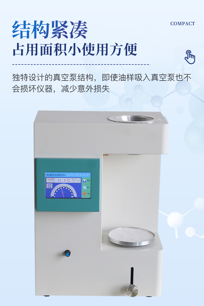 产品简介机械杂质测定仪是按照GB/T 511-2010《石油和石油产品及添加剂机械杂质测定法》设计和制造的。适用于测定石油产品中的各种烃、重质油、润滑油及添加剂的机械杂质含量。可广泛应用于电力、石油、化工、商检及科研部门。内置无油免维护真空泵,金属浴恒温漏斗,一台仪器主机完成所有功能,无需外接真空泵和