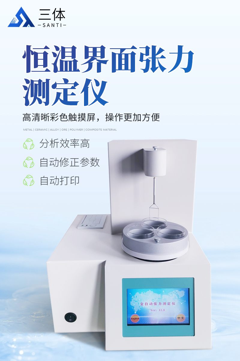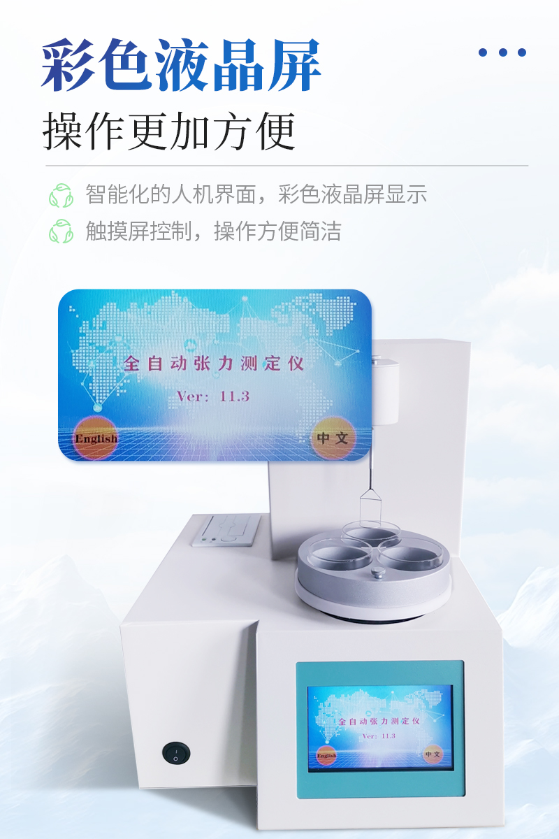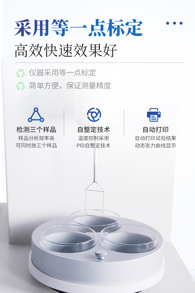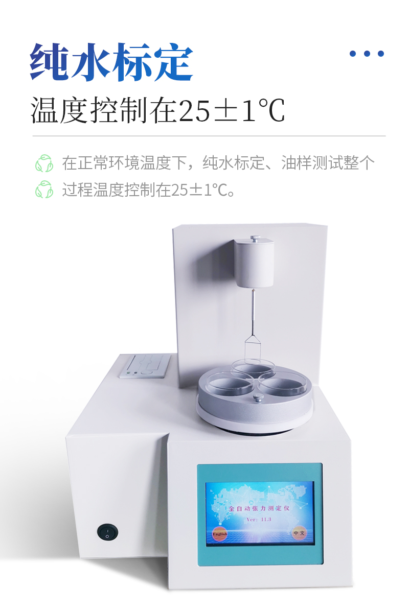 仪器特点★ 在正常环境温度下,纯水标定、油样测试整个过程温度控制在25±1℃。★ 温度控制采用PID自整定技术★ 样品分析效率高,可同时放三个样品★ 使用不同测量环仪器自动修正参数★ 自动打印试验结果,动态张力曲线显示★仪器采用等一点标定,简单方便,保证测量精度;★高清晰彩色触摸