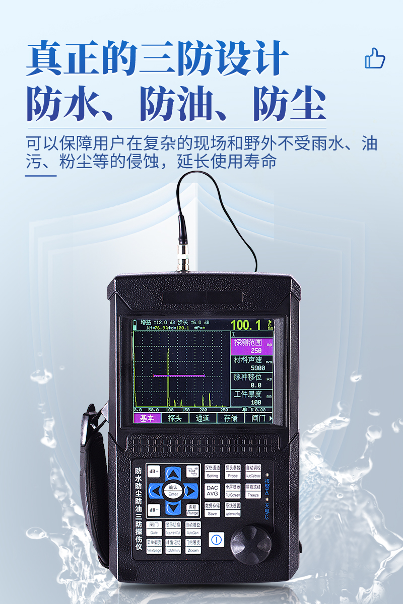 ● 真正的三防设计,可以保障用户在复杂的现场和野外不受雨水、油污、粉尘等的侵蚀,让探伤仪的使用寿命大大延长